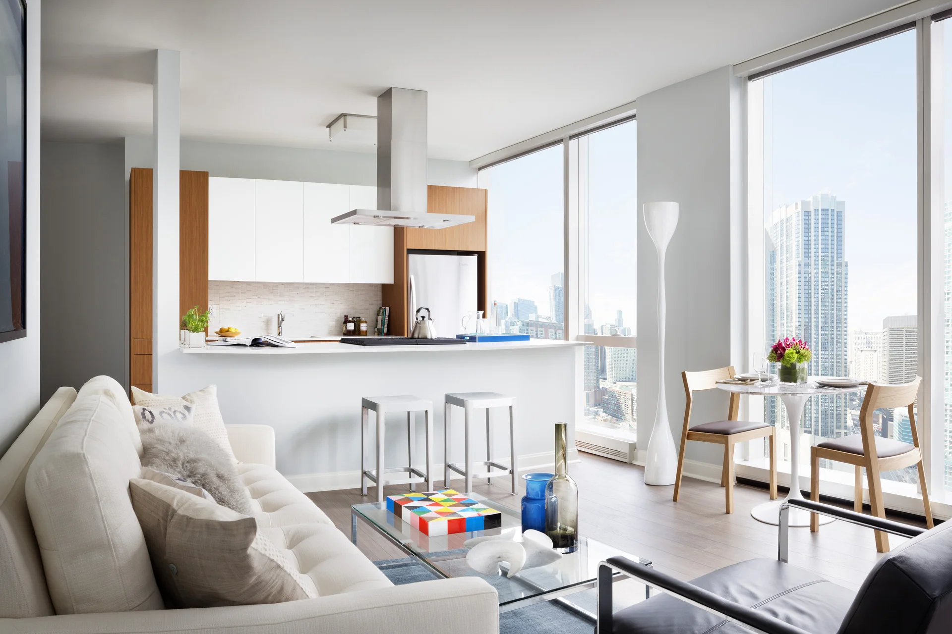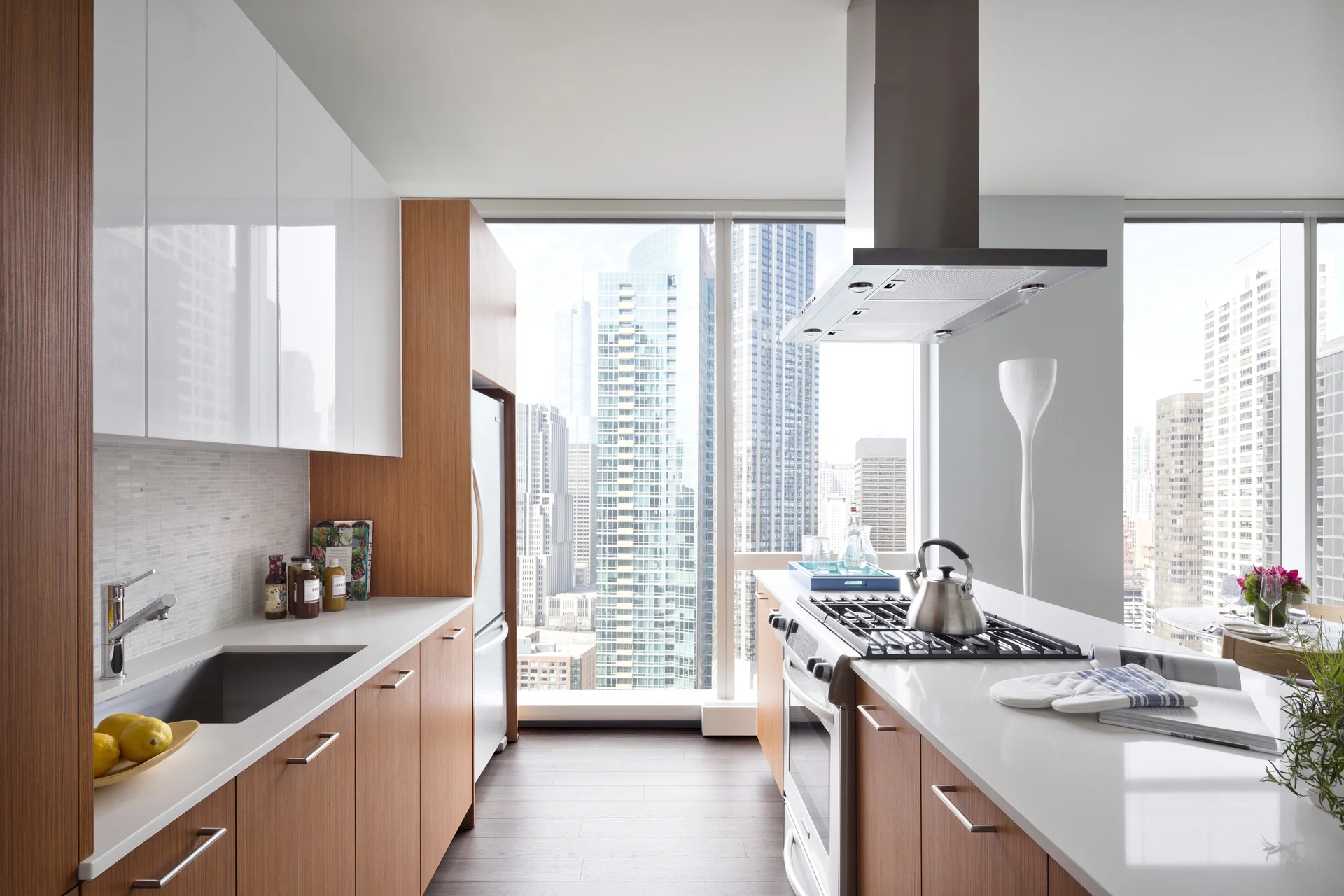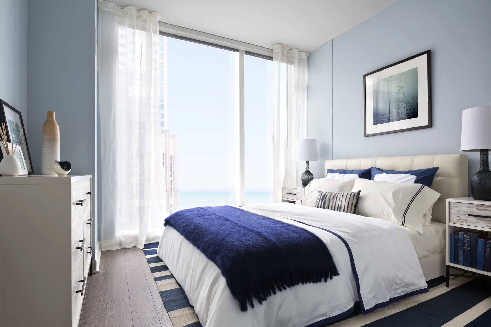 Spectacular, high floor 2-bedroom apartment home with beautiful views of the lake and city. Split floor plan for maximum privacy between bedrooms, grey, wood-finish flooring throughout and lots of sunlight through floor to ceiling windows. Open-style kitchen complete with two-tone, Italian cabinetry, marble backsplash, integrated dishwasher and Kitchenaid appliances, gas range with floating vent hood and a large island for entertaining. Multiple custom closets with built-in shelving, stackable washer/dryer, tri-view medicine cabinet for additional storage in the bathroom and Nest thermostats for year-round temperature control.